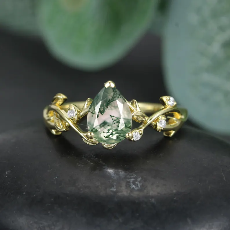 Pear cut moss agate Engagement Ring,14K Yellow Gold Wedding Ring,natural Moss Agate Gemstone Ring, Anniversary Gift for Her