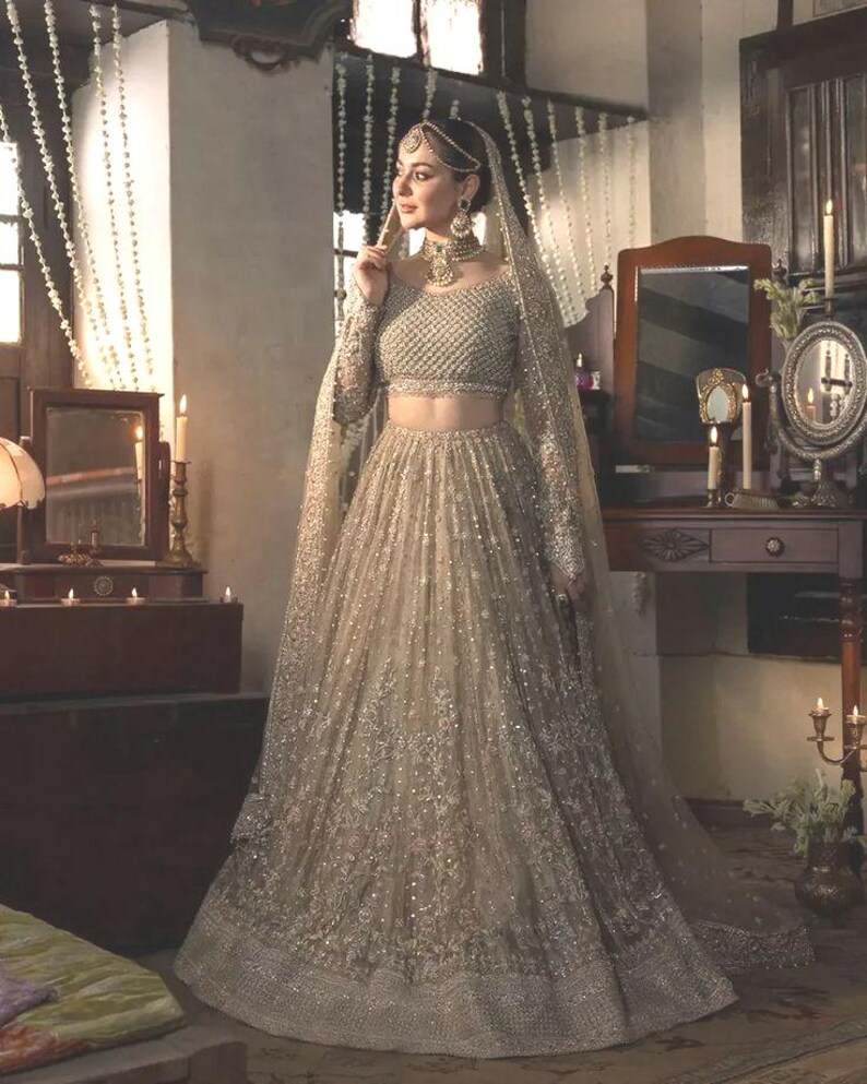 Step into timeless elegance with this breathtaking hand-embellished lehenga choli, perfect for brides and festive occasions. Crafted in a luxurious champagne gold tone, this ensemble features:
