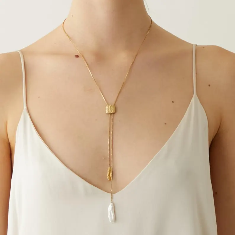 A delicate blend of minimalism and elegance, this lariat-style necklace features a lightly hammered gold bead that slides effortlessly to adjust length — finished with a freshwater pearl drop and polished gold charm for movement and shine.