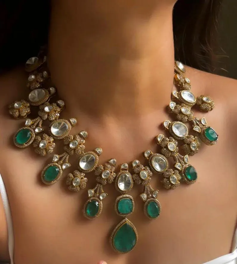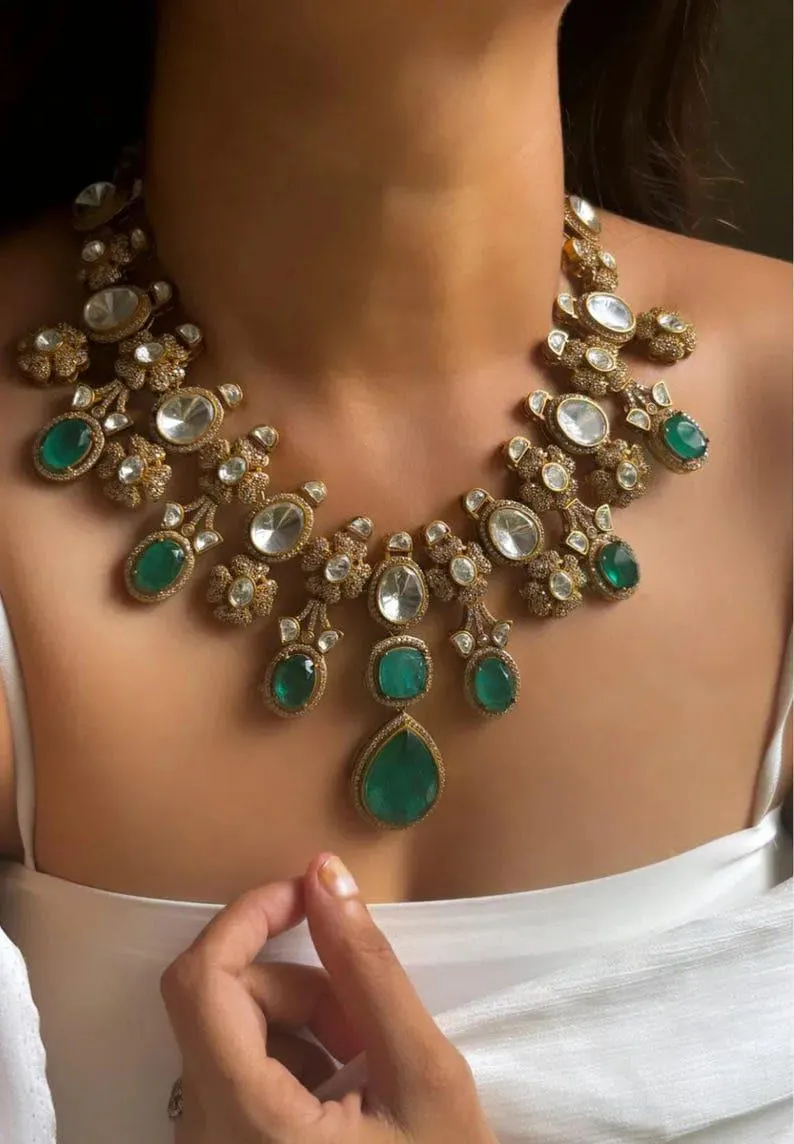Stunning Sabyasachi Inspired Bridal Indian Gold Plated Emerald Green Uncut Moissanite Polki Kundan wedding Jewelry