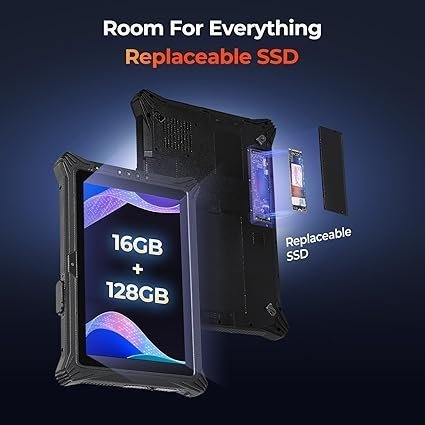 • [Expandable Storage] With an impressive 16GB RAM and a 128GB internal SSD, IRT10 Windows rugged tablet provides ample space for your applications, files, and projects. Moreover, the replaceable SSD feature, which supports up to 4TB, allows you to easily upgrade your storage capacity whenever necessary. This flexibility ensures that you never run out of space, keeping your data secure and your workflow uninterrupted.