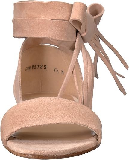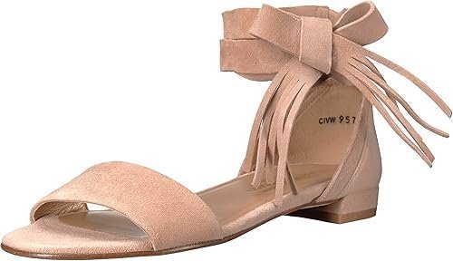 • Suede sandal with ankle-wrap tie closure featuring fringe ends