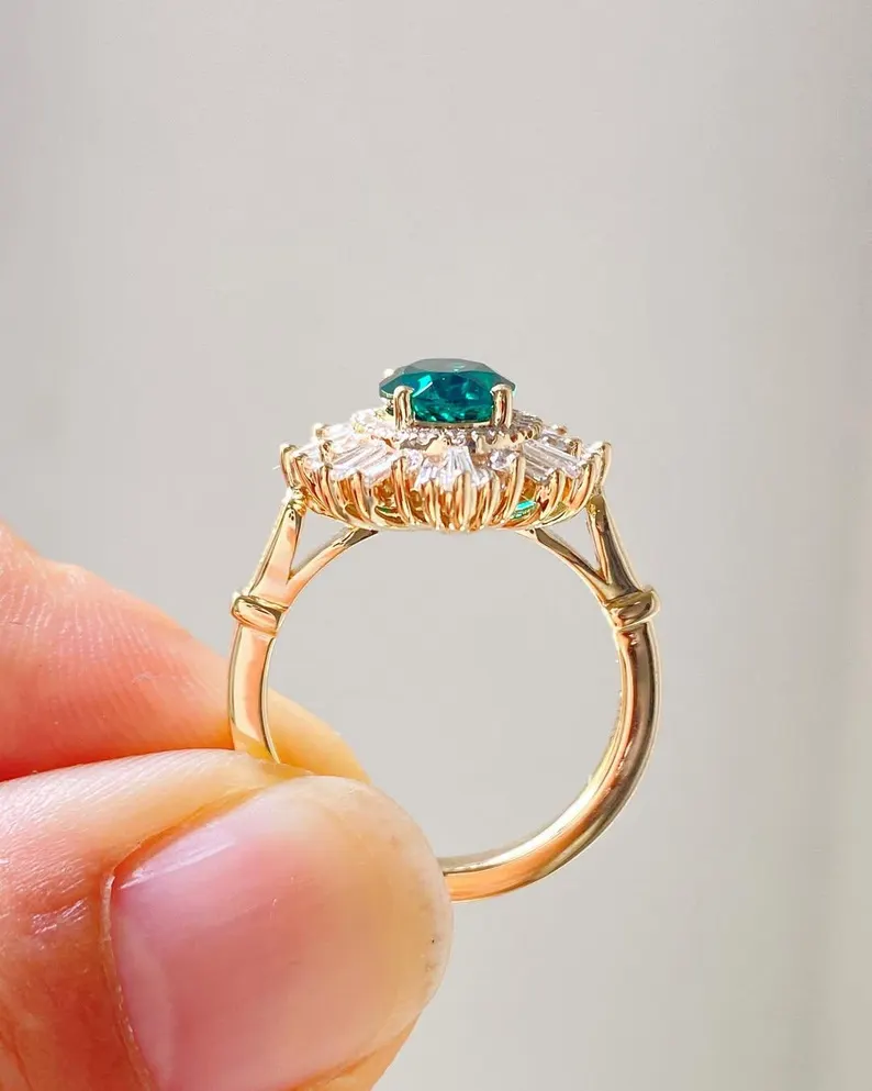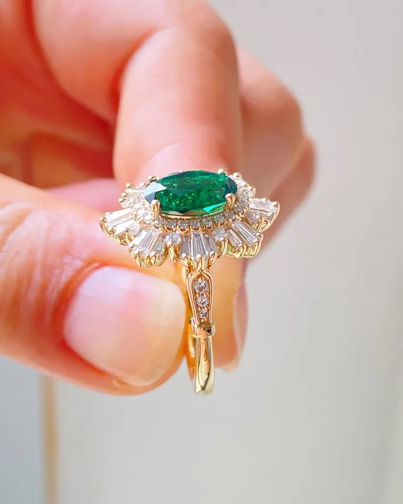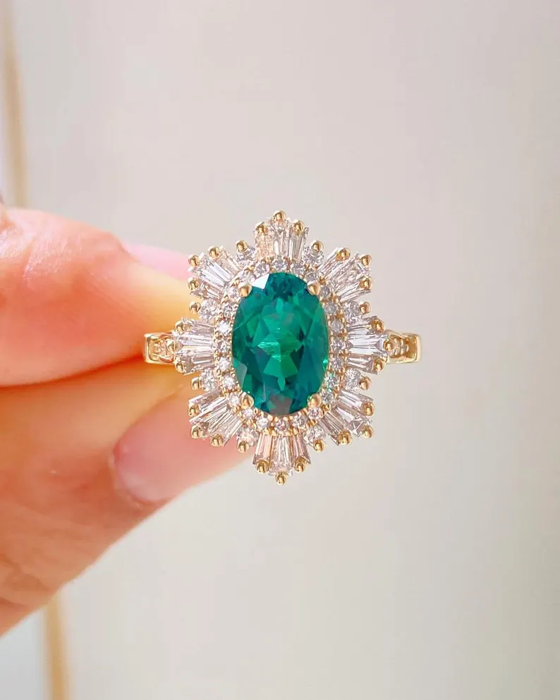 2CT Sunburst Oval Cut Green Moissanite Engagement Ring, Starburst Art Deco Ring, Oval Cut Sunburst Halo Moissanite Ring, Vintage Wedding Set